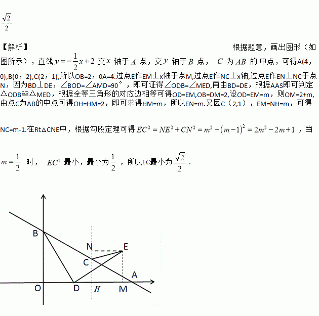 已知直线交轴于点,交轴于点, 为的中点, 为射线上一点,连,将绕点顺时针旋转得线段,则的最小值为__________.