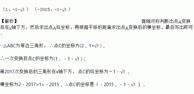 如图,等边三角形的顶点A(1,1),B(3,1),规定把等边△ABC“先沿x轴翻折,再向左平移1个单位”为一次变换,则一次变换后顶点C的坐标为____,如果这样连续经过2 017次变换后,等边△ABC的顶点C的坐标为____.