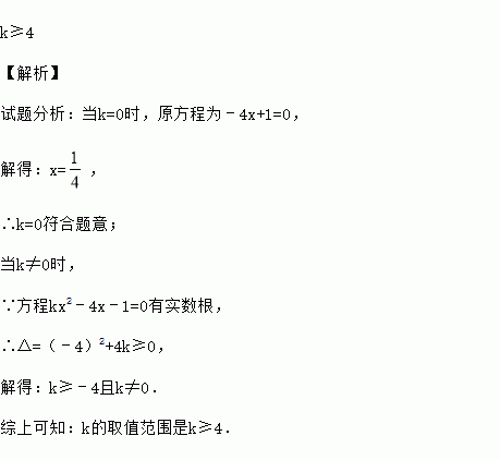 k≥4 【解析】 试题分析:当k=0时,原方程为﹣4x+1=0, 解得:x=, ∴k=0符合题意; 当k≠0时, ∵方程kx2﹣4x﹣1=0有实数根, ∴△=(﹣4)2+4k≥0, 解得:k≥﹣4且k≠0. 综上可知:k的取值范围是k≥4.