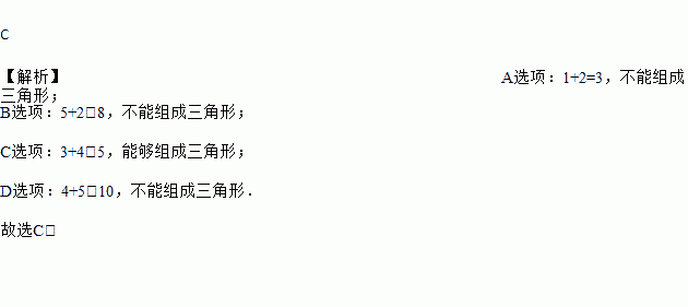 C 【解析】A选项:1+2=3,不能组成三角形; B选项:5+2<8,不能组成三角形; C选项:3+4>5,能够组成三角形; D选项:4+5<10,不能组成三角形. 故选C.