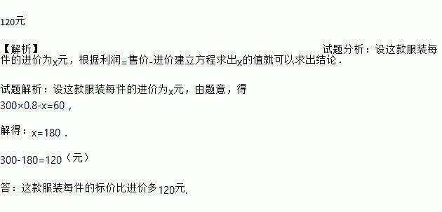 120元 【解析】试题分析:设这款服装每件的进价为x元,根据利润=售价-进价建立方程求出x的值就可以求出结论. 试题解析:设这款服装每件的进价为x元,由题意,得 300×0.8-x=60, 解得:x=180. 300-180=120(元) 答:这款服装每件的标价比进价多120元.