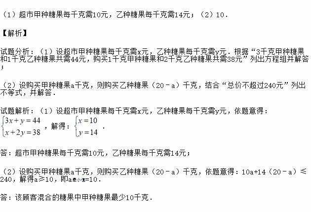 (2)若购买甲、乙两种糖果共20千克,且总价不超过240元,问甲种糖果最少购买多少千克?