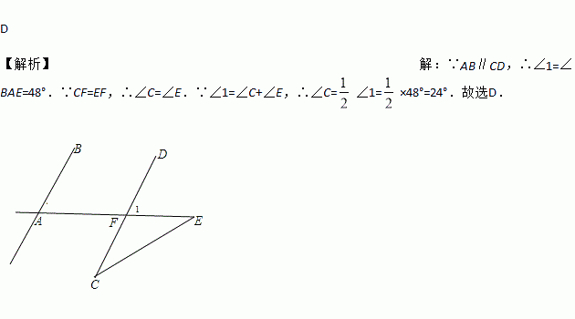D 【解析】【解析】 ∵AB∥CD,∴∠1=∠BAE=48°.∵CF=EF,∴∠C=∠E.∵∠1=∠C+∠E,∴∠C=∠1=×48°=24°.故选D.