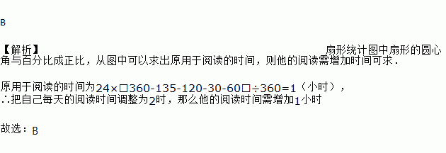 如图是小刚一天中的作息时间分配的扇形统计图,如果小刚希望把自己每天的阅读时间调整为2小时,那么他的阅读时间需增加( )