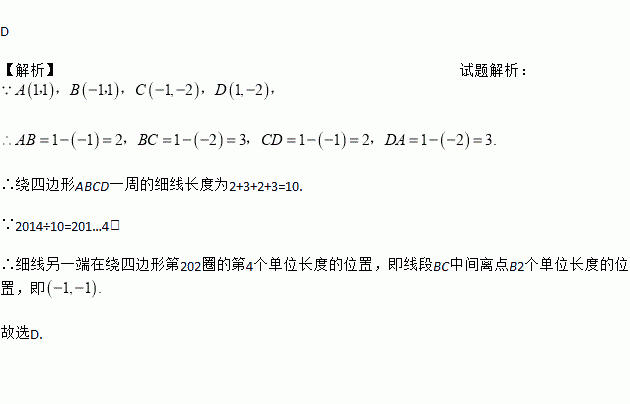 如图,在平面直角坐标系中,A(1,1),B(﹣1,1),C(﹣1,﹣2),D(1,﹣2).把一条长为2014个单位长度且没有弹性的细线(线的粗细忽略不计)的一端固定在点A处,并按A﹣B﹣C﹣D﹣A…的规律绕在四边形ABCD的边上,则细线另一端所在位置的点的坐标是( )
