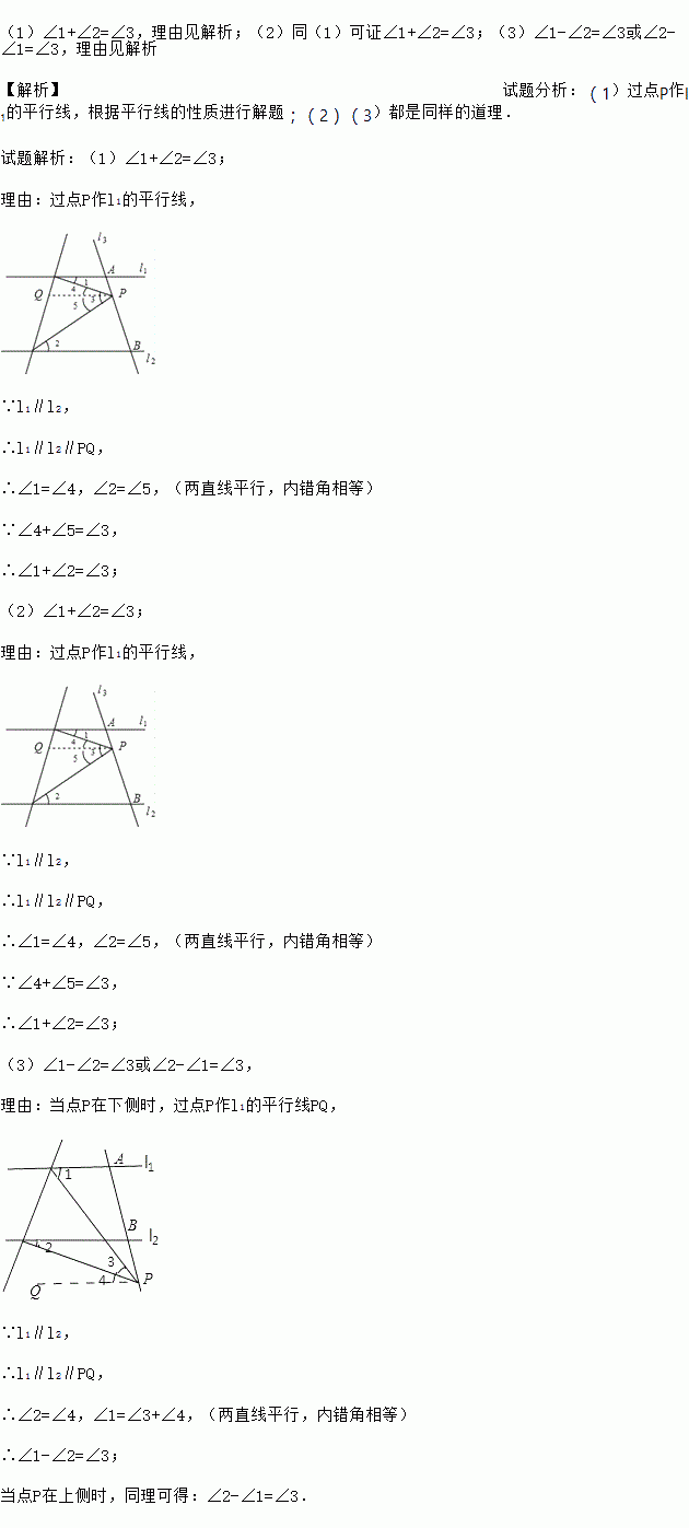 如图,已知直线l1∥l2,且l3和l1、l2分别交于A、B两点,点P在直线AB上.