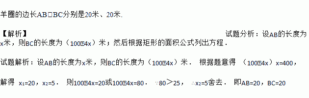 如图,要利用一面墙(墙长为25米)建羊圈,用100米的围栏围成总面积为400平方米的三个大小相同的矩形羊圈,求羊圈的边长AB,BC各为多少米?