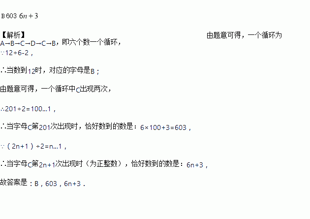 图为手的示意图,在各个手指间标记字母 A,B,C,D.请你按图中箭头所指方向(即 A→B→C→D→C→B→A→B→C → … 的方式)从 A 开始数连续的正整数 1,2,3,4,…,当数到