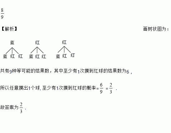 【解析】画树状图为: 共有9种等可能的结果数,其中至少有1次摸到红球的结果数为6, 所以任意摸出1个球, 至少有1次摸到红球的概率== . 故答案为.