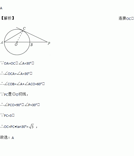 如图,已知AB是⊙O的直径,点C在⊙O上,过点C的切线与AB的延长线交于点P,连接AC,若∠A=30°,PC=3,则⊙O的半径为( )