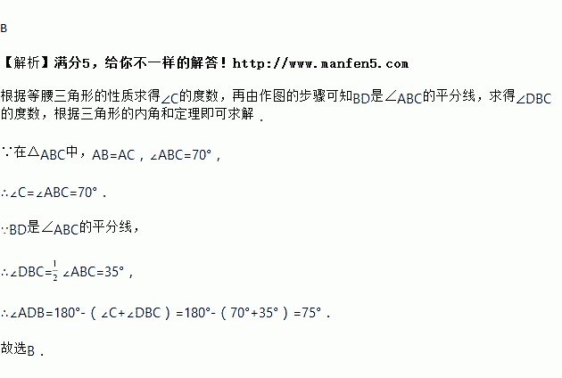 如图,在△ABC中,AB=AC,∠ABC=70°,以B为圆心,任意长为半径画弧交AB,BC于点E,F,再分别以点E,F为圆心、以大于