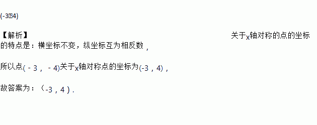(-3,4) 【解析】关于x轴对称的点的坐标的特点是:横坐标不变,纵坐标互为相反数, 所以点(﹣3,﹣4)关于x轴对称点的坐标为(-3,4), 故答案为:(-3,4).