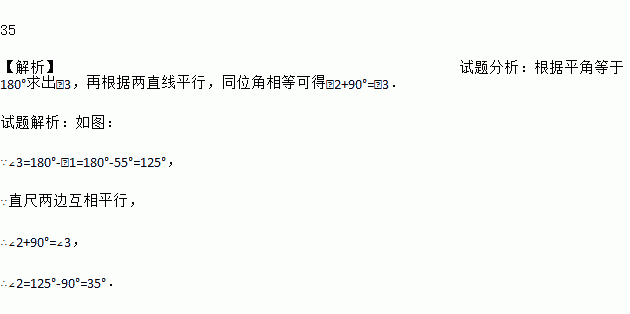如图,将三角板的直角顶点放在直尺的一边上,若∠1=55°,则∠2的度数为_______°.