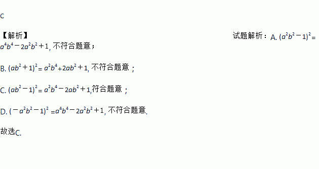 C 【解析】试题解析:A. (a2b2-1)2= a4b4-2a2b2+1, 不符合题意; B. (ab2+1)2= a2b4+2ab2+1, 不符合题意; C. (ab2-1)2= a2b4-2ab2+1,符合题意; D. (-a2b2-1)2 =a4b4-2a2b2+1, 不符合题意. 故选C.