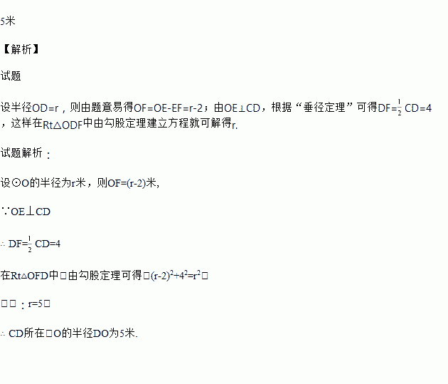 如图为桥洞的形状,其正视图是由和矩形ABCD构成.O点为所在⊙O的圆心,点O又恰好在AB为水面处.若桥洞跨度CD为8米,拱高(OE⊥弦CD于点F )EF为2米.求所在⊙O的半径DO.