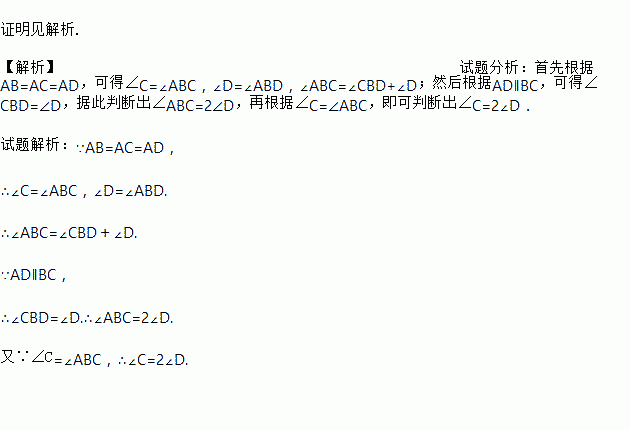 如图,已知AB=AC=AD,且AD∥BC,求证:∠C=2∠D.