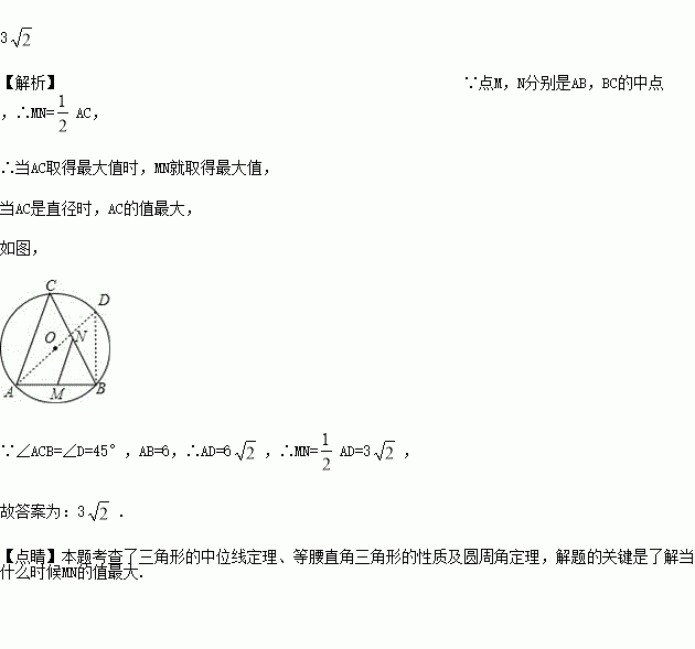 如图,AB是⊙O的弦,AB=6,点C是⊙O上的一个动点,且∠ACB=45°.若点M,N分别是AB,BC的中点,则MN长的最大值是______.