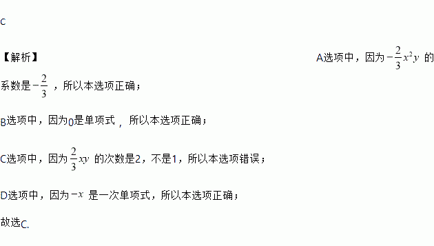A. -x2y的系数是- B. 0是单项式