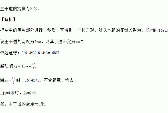 如图是中北居民小区某一休闲场所的平面示意图.图中阴影部分是草坪和健身器材安装区,空白部分是用做散步的道路.东西方向的一条主干道较宽,其余道路的宽度相等,主干道的宽度是其余道路的宽度的倍.这块休闲场所南北长![]()