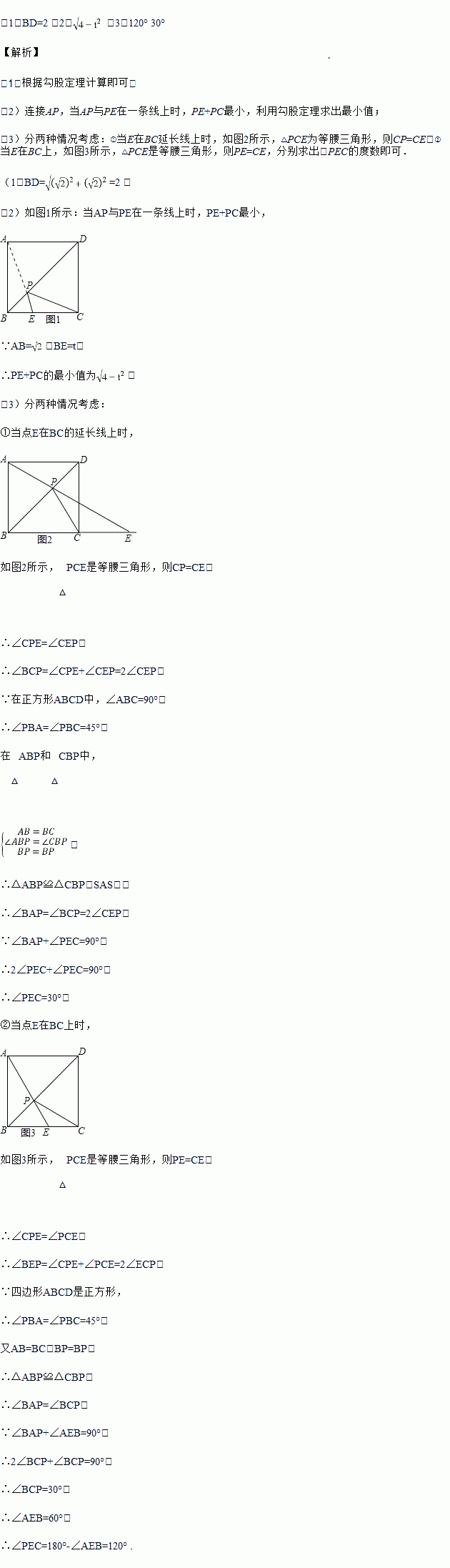 (2)若BE=t,连结PE、PC,求PE+PC的最小值(用含t的代数式表示);