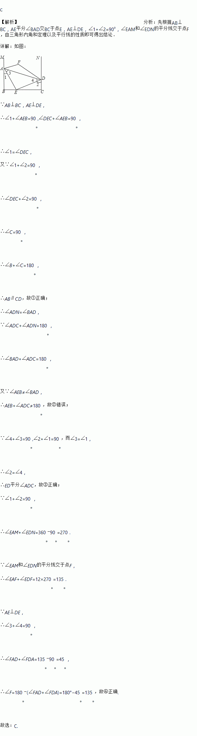 如图,AB⊥BC,AE平分∠BAD交BC于点E,AE⊥DE,∠1+∠2=90°,M,N分别是BA,CD延长线上的点,∠EAM和∠EDN的平分线交于点F.下列结论:①AB∥CD;②∠AEB+∠ADC=180°;③DE平分∠ADC;④∠F为定值其中结论正确的有( )