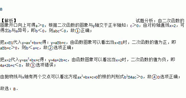 B 【解析】试题分析:由二次函数的图象开口向上可得a>0,根据二次函数的图象与y轴交于正半轴知:c>0,由对称轴直线x=2,可得出b与a异号,即b<0,则abc<0,故①正确; 把x=﹣1代入y=ax2+bx+c得:y=a﹣b+c,由函数图象可以看出当x=﹣1时,二次函数的值为正,即a﹣b+c>0,则b<a+c,故②选项正确; 把x=2代入y=ax2+bx+c得:y=4a+2b+...