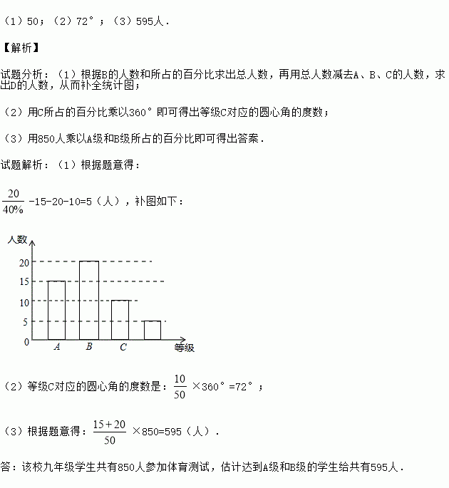 (3)若该校九年级学生共有850人参加体育测试,估计达到A级和B级的学生共有多少人?