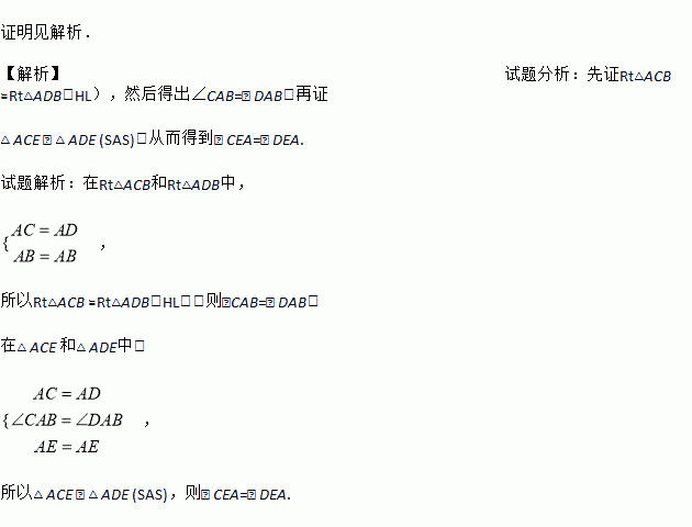 如图所示,E为AB延长线上的一点,AC⊥BC于C,AD⊥BD于D,AC=AD.求证:∠CEA=∠DEA.