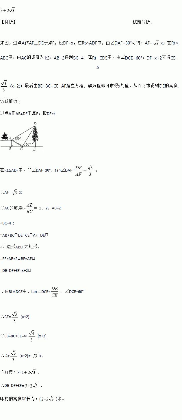 某班数学课外活动小组的同学欲测量公园内一棵树DE的高度,他们在这棵树正前方一楼亭前的台阶上A点处测得树顶端D的仰角为30°,朝着这棵树的方向走到台阶下的点C处测得树顶端D的仰角为60°,已知A点的高度AB为2米,台阶AC的坡度i=1:2,且B,C,E三点在同一条直线上,请根据以上条件求出树DE的高度.(测倾器的高度忽略不计,结果保留根号)