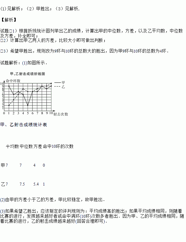 为了从甲、乙两名选手中选拔一人参加射击比赛,现对他们进行一次测验,两个人在相同条件下各射靶10次,为了比较两人的成绩,制作了如下统计图表: