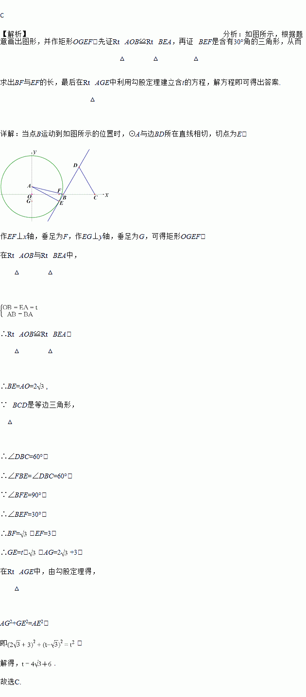 ),动点B、C从原点O同时出发,分别以每秒1个单位和每秒2个单位长度的速度沿x轴正方向运动,以点A为圆心,OB的长为半径画圆;以BC为一边,在x轴上方作等边△BCD.设运动的时间为t秒,当⊙A与△BCD的边BD所在直线相切时,t的值为( )