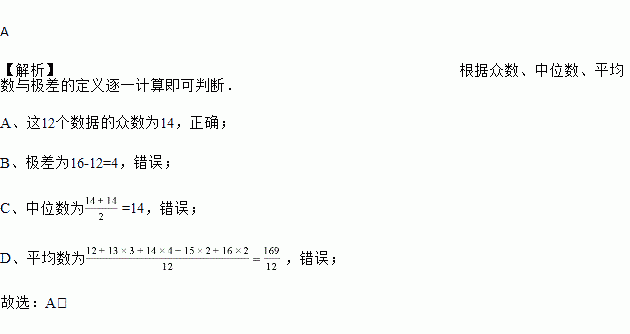 A. 众数为14 B. 极差为3 C. 中位数为13 D. 平均数为14