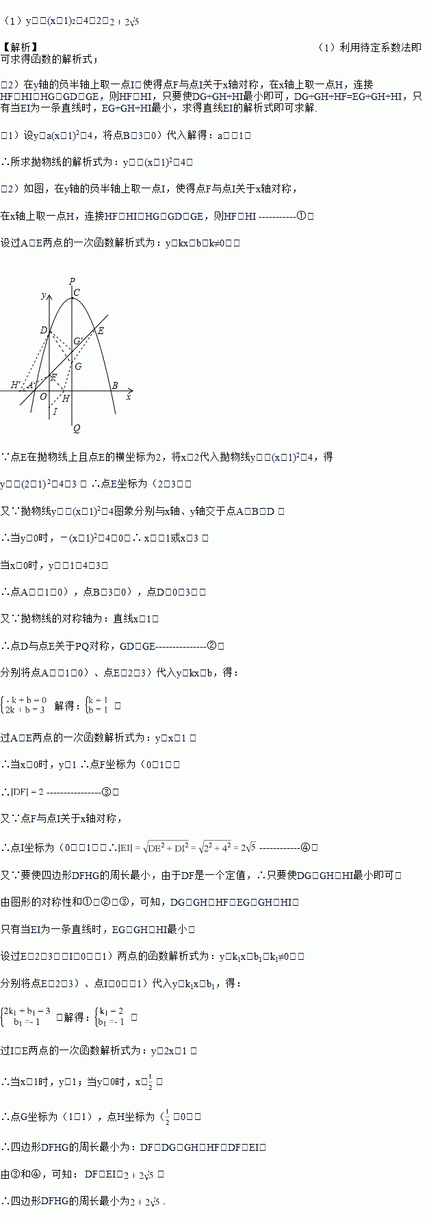 (2)过点A的直线与抛物线交于点E,交y轴于点F,其中点E的横坐标为2,若直线PQ为抛物线的对称轴,点G为直线PQ上的一动点,在x轴上找一点H,使D、G、H、F四点所围成的四边形周长最小.求出这个最小值及点G、H的坐标.