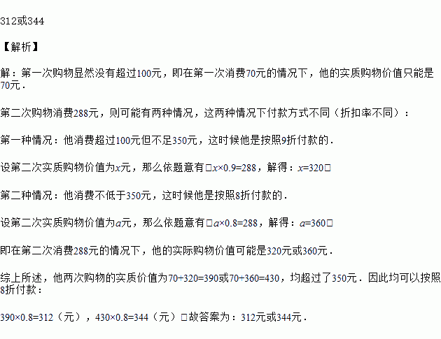 ③一次性购物在350元(含350元)以上,一律享受八折优惠.小敏在该超市两次购物分别付款70元和288元,如果小敏把这两次购物改为一次性购物,则应付款_____元.