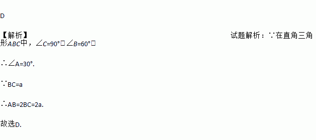 如图,在直角三角形ABC中,∠C=90°,∠B=60°,BC=a,AC=b,则AB的长是( )