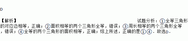 D 【解析】试题分析:①全等三角形的对应边相等,正确;②面积相等的两个三角形全等,错误;③周长相等的两个三角形全等,错误;④全等的两个三角形的面积相等,正确;综上所述,正确的是①④.故选D.