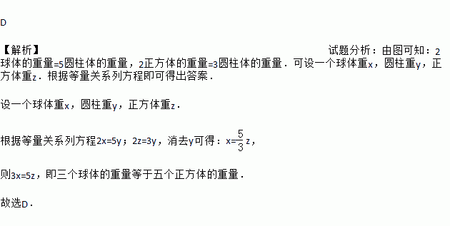 中央电视台2套“开心辞典”栏目中,有一期的题目如图所示,两个天平都平衡,则三个球体的重量等于多少个正方体的重量