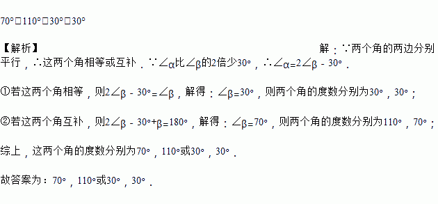 如果∠α的两边分别平行于∠β的两边,且∠α比∠β的2倍少30°,则∠α,∠β的度数分别是____.
