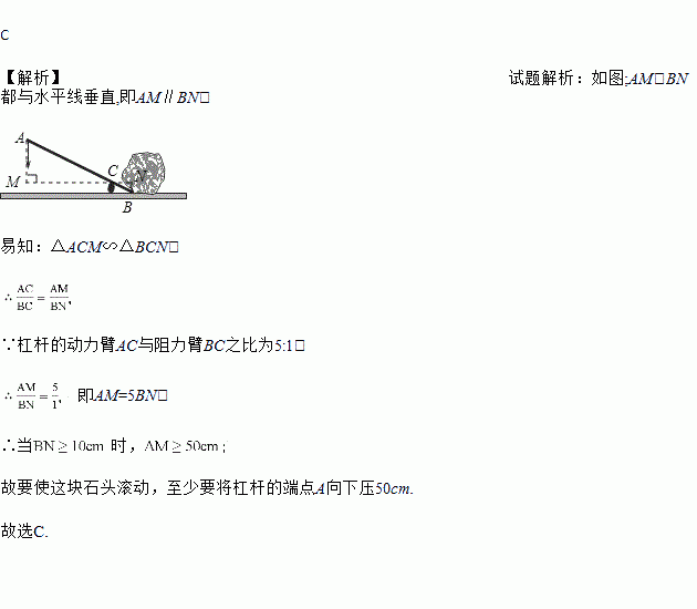 如图,是用杠杆撬石头的示意图,C是支点,当用力压杠杆的A端时,杠杆绕C点转动,另一端B向上翘起,石头就被撬动.现有一块石头,要使其滚动,杠杆的B端必须向上翘起10cm,已知杠杆的动力臂AC与阻力臂BC之比为5∶1,则要使这块石头滚动,至少要将杠杆A端向下压( )