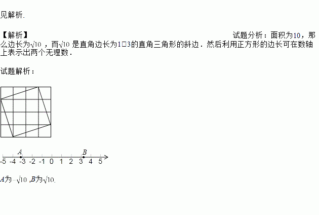 利用4×4方格,作出面积为10平方厘米的正方形,然后在数轴上表示实数与.