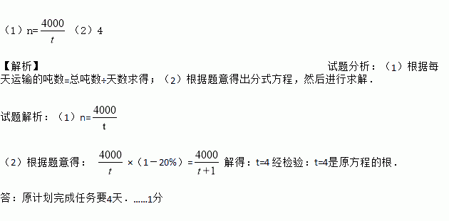 (1)n=(2)4 【解析】试题分析:(1)根据每天运输的吨数=总吨数÷天数求得;(2)根据题意得出分式方程,然后进行求解. 试题解析:(1)n= (2)根据题意得: ×(1-20%)=解得:t=4 经检验:t=4是原方程的根. 答:原计划完成任务要4天.……1分