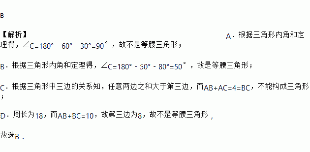 B 【解析】A.根据三角形内角和定理得,∠C=180°﹣60°﹣30°=90°,故不是等腰三角形; B.根据三角形内角和定理得,∠C=180°﹣50°﹣80°=50°,故是等腰三角形; C.根据三角形中三边的关系知,任意两边之和大于第三边,而AB+AC=4=BC,不能构成三角形; D.周长为18,而AB+BC=10,故第三边为8,故不是等腰三角形, 故选B.