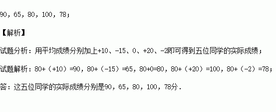 (5分)七年级一班某次数学测验的平均成绩为80分,数学老师以平均成绩为基准,记作0,把小龙、小聪、小梅、小莉、小刚这五位同学的成绩简记为+10,–15,0,+20,–2.问这五位同学的实际成绩分别是多少分?