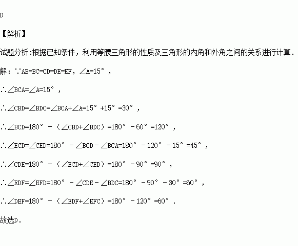 如图,∠A=15°,AB=BC=CD=DE=EF,则∠DEF等于( )