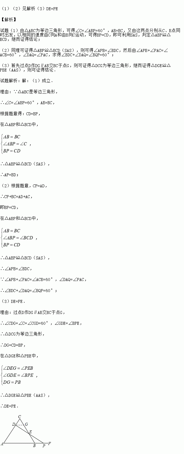 (1)△ABC为等边三角形,动点D在边CA上,动点P在边BC上,若这两点分别从C、B点同时出发,以相同的速度由C向A和由B向C运动,连接AP,BD交于点Q,两点运动过程中AP=BD成立吗?请证明你的结论;