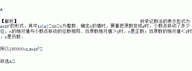 A 【解析】科学记数法的表示形式为a×10n的形式,其中1≤|a|<10,n为整数.确定n的值时,要看把原数变成a时,小数点移动了多少位,n的绝对值与小数点移动的位数相同.当原数绝对值>1时,n是正数;当原数的绝对值<1时,n是负数. 所以180000=1.8×105, 故选A.