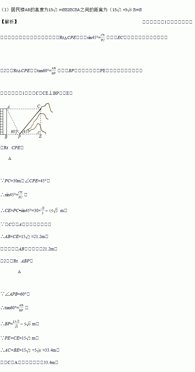 如图,一居民楼底部B与山脚P位于同一水平线上,小李在P处测得居民楼顶A的仰角为60°,然后他从P处沿坡角为45°的山坡向上走到C处,这时,PC=30m,点C与点A恰好在同一水平线上,点A、B、P、C在同一平面内.