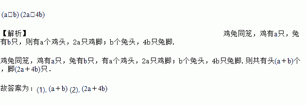 鸡兔同笼,鸡有a只,兔有b只,则共有头________个,脚 ________只.