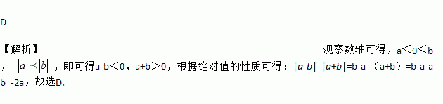 D 【解析】观察数轴可得,a<0<b, ,即可得a-b<0,a+b>0,根据绝对值的性质可得:|a-b|-|a+b|=b-a-(a+b)=b-a-a-b=-2a,故选D.