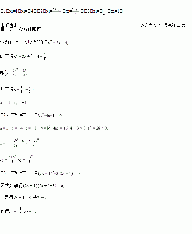 (1)x2+3x﹣4=0(用配方法)